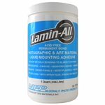 McDonald Photo Products LAMIN-AII ADHESIVE is a photographic and art material liquid mounting permanent bond adhesive that is acid free. Available in quart, gallon and 5 gallon sizes.