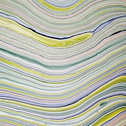 Every sheet of this gorgeous handmade marble is unique, with swirling tones of blues, greens, lime, and taupe browns. The mulberry base paper is initially machine made from kozo fibers and short pulp, then hand-marbled by floating each sheet on top of a bath of swirling oil colors and lifted carefully to reveal the swirling marbled pattern, then set aside to dry. A light text weight, this smooth mulberry paper folds beautifully for origami, book arts and more.