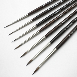 Stringent manufacturing standards have been adhered to in producing these quality brushes. Best quality extra-fine pure grey squirrel is chosen for its exceptional fineness and elasticity. The handle is an extension of the hand - it is ergonomically designed and made of solid matte varnished blond oak stained to a deep finish, a timeless wood with a soft and sensual feel. The ferrule is also ergonomically designed and is made with matte nickel; the crimping is discreet and designed to blend perfectly with the handle. A protective cap keeps the brush head well shaped and away from harm. The bottom tip of the handle is angled with a sgraffito tip for techniques involving scratching and scraping into the paper.
