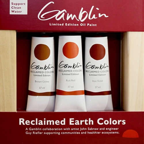 Gamblin has volunteered countless (wo)man hours formulating, testing, naming, designing, and creating Gamblin Reclaimed Earth Colors: Rust Red, Iron Violet, and Brown Ochre. Purchasing this set not only benefits the project financially, but it literally and directly creates a demand for the pigment and a demand for clean rivers. The sleeve and insert for this product are recyclable, and the