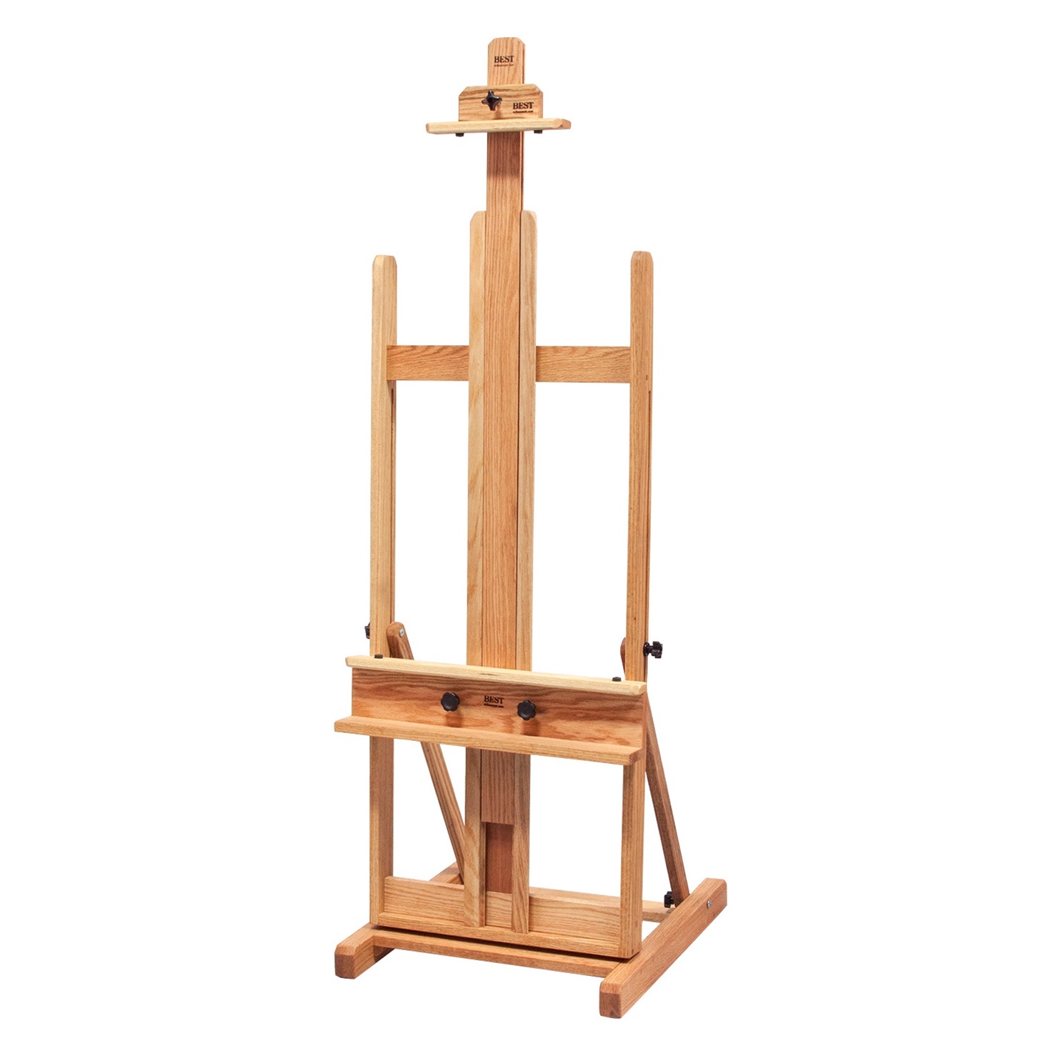 Best Classic Dulce Solid Oak Easel - An elegant studio easel for the serious painter. Each BEST Easel is made of American oak, sanded to a smooth surface, then hand-rubbed with oil to reveal the inherent beauty of the wood grain. The craftsmen at BEST nail, glue, and wood screw every joint, guaranteeing strength and precision. Only the highest quality hardware is used as these easels are constructed to last a lifetime. Minimum easel height 54 inches, maximum height 90 inches. Base measures 22 inches wide by 24 inches deep. Holds canvasses up to 7ft high. This easel can be shipped by UPS for $39.00 anywhere in the 48 contiguous states.
