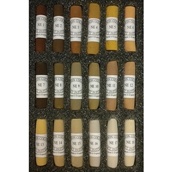From a converted coach house in Northumberland, England, artist John Hersey and a small batch of artisans lovingly make Unison pastels by hand. They make small batches of 100 to 200 pastels at a time. Each stick is hand rolled and allowed to air dry. There is a richness, smoothness, and intensity in these pastels that you can not find in any other line. Unison pastels are a hand made work of art themselves! This set contains Unison Natural Earth tones 1-18. Perfect for all subjects- landscape, portrait, still life, and more!