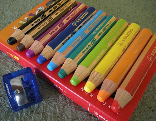 This intro set of Stabilo Woody crayons contains a terrific color palette for just about any kind of artwork. Stabilo Woody crayons mix beautifully with water to produce artwork that is a mixture of drawing and watercolor painting. This set includes 10 crayons and one crayon sharpener. Non-toxic.