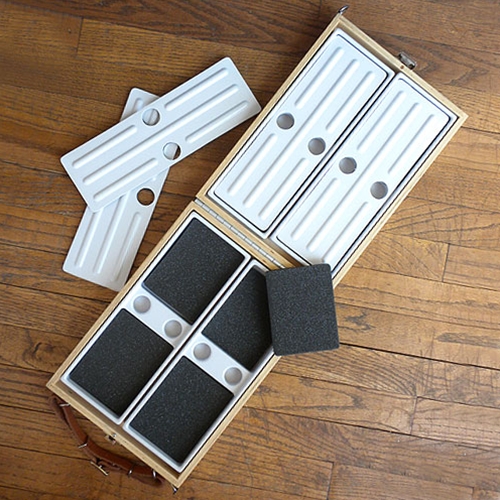 Sturdy and lightweight wooden carrier for pastels can be used to keep your pastels organized and easily transported out to the field. Inside the carrier are four removable Foam Lined Pastel Trays™. The trays will hold assorted sizes including many larger diameter and handmade pastels. Foam is removable for easy cleaning. Includes foam-lined lid.